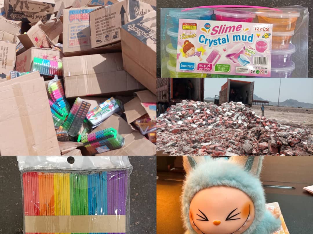 هيئة المواصفات بعدن تتلف أدوات مدرسية وألعاب أطفال مخالفة وتمنع دخول منتجات غير مطابقة في الوديعة وشحن
