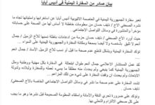 أصدرت سفارة الجمهورية اليمنية في العاصمة الإثيوبية أديس أبابا، بياناً نفت فيه ما تم تداوله مؤخراً على منصات التواصل الاجتماعي من قِبل الصحفي نايف حسان، معتبرة تلك المعلومات “خاطئة ولا أساس لها من الصحة” وتمثل إساءة للسفارة وموظفيها.