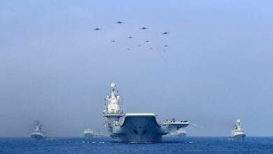 شمسان بوست أول حاملة طائرات صينية “لياونينغ ” خلال مشاركتها في عرض عسكري في بحر الصين الجنوبيترافقها سفن حربية وطائرات…